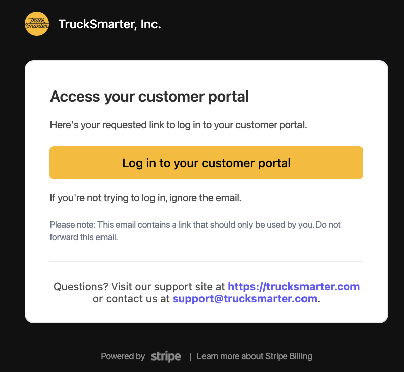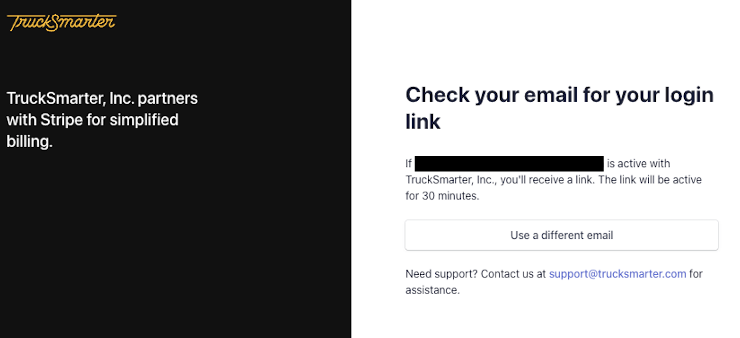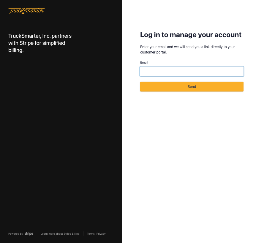 Step 2: Verify email with Stripe. You will receive an email with a link to directly manage your subscription or update your payment method. Please note, the email will come from a Stripe billing address, but should include TruckSmarter information.